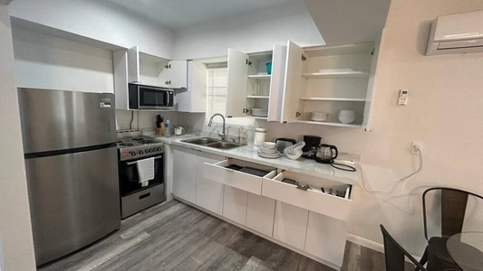 Equipped with all you need for your stay. Kitchen with full utensils, wifi, smart tv, shared washer&dryer, linen, towels, etc. Parking spot available on premises.