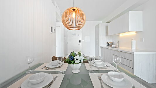 The apartment features a comfortable queen-size bed, a sofa bed suitable for a third guest, two Smart TVs, and a private wide balcony. Guests will enjoy a fully equipped kitchenette, dishwasher, and in-unit washer and dryer, providing everything needed for short or extended stays.