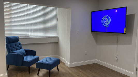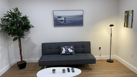 Acogedora sala de estar con TV grande, un sofá para relajarse.