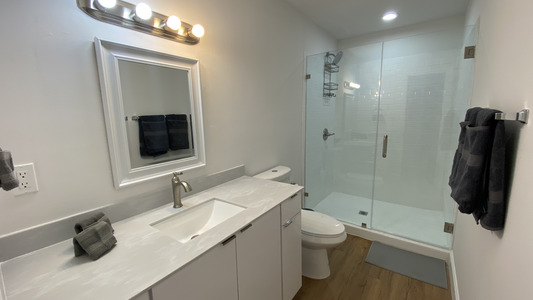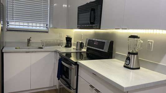 Inside the unit, there was dust on the kitchen counters & oven, as well as hair on the toilet seat & stains in the shower. We purchased cleaning supplies and cleaned the space ourselves to avoid delays. The host was responsive & checked in, but we had a tight schedule.