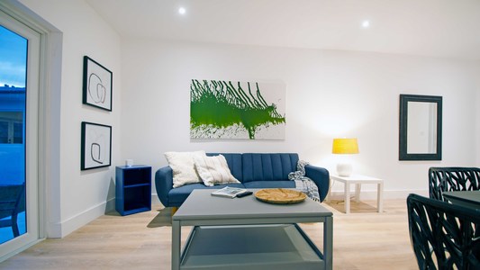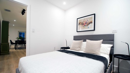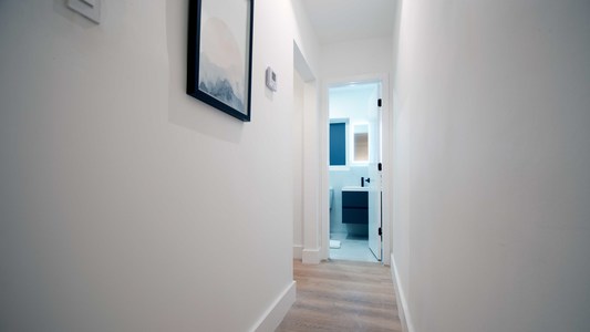 Es una casa remodelada con 4 apartamentos (cada uno con su propia cocina, baño, sala de estar, y 2 dormitorios)