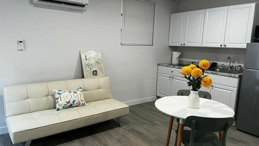 Este estudio renovado está totalmente equipado con una cocina con estufa, refrigerador y utensilios de cocina. Un baño, Smart TV, sofá y Split A/C.