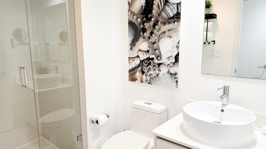 Suministros de baño: toallas, alfombra de baño, secador de pelo, papel higiénico inicial y artículos de tocador incluidos.